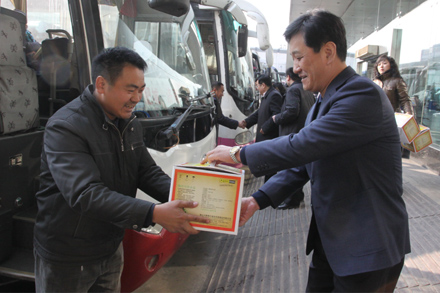 2月2日是大年三十,下午兩點鐘,集團公司領(lǐng)導(dǎo)來到總站南北兩區(qū),走訪看望車站干部職工,歡送春運末班車,并向駕乘人員贈送了春節(jié)紀念品。在總站候車大廳,吳宗昌董事長簡要回顧了節(jié)前春運的整體情況,感謝大家春運期間的辛勤工作,代表領(lǐng)導(dǎo)班子向所有干部職工拜年,并與車站干部職工合影留念。來到發(fā)車區(qū),吳宗昌董事長、王謙總經(jīng)理帶領(lǐng)集團公司領(lǐng)導(dǎo)班子分別慰問了春運末班車的駕乘人員,贈送了春節(jié)紀念品,并囑咐他們開好最后一班車,把旅客安全送回家。