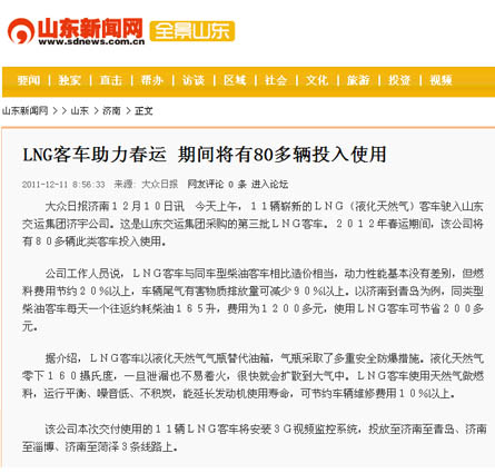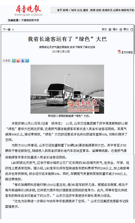 在采訪活動中,采訪團深入蘇州金龍客車制造車間,觀看了車輛從車架組裝、整車陰極電泳到制動配制等流水制造的全過程,體驗了客車制造的嚴密工序;在金龍客車廠產品展室,記者們了解了蘇州金龍客車廠的發展歷史及企業安全文化,對燃氣清潔能源客車所應用的新技術、新工藝、新材料有了更進一步的認識;在蘇州金龍客車廠會議室,總工程師張衛林將燃氣清潔能源客車與汽油、柴油等能源客車進行比對,向記者詳細介紹了燃氣清潔能源環保客車在安全、環保、節能等方面的優勢;在“山東交運集團清潔能源環保客車交車儀式”上,各新聞媒體記者又對本次燃氣清潔能源環保客車車輛安全運營、節能減排、線路投放等情況,進行了現場采訪和隨行拍攝。12月9日晚22點,集團公司燃氣清潔能源環保客車車隊經一路跋涉平安抵濟,12月10日晚,省電視臺山東衛視頻道在《新聞聯播》欄目、濟南市電視臺濟南新聞頻道在《濟南新聞》欄目以及《大眾日報》、《齊魯晚報》、《山東商報》、《生活日報》、《現代交通報》、《濟南日報》、《濟南時報》、《交通廣播》等媒體都對集團公司燃氣清潔能源環保客車投入春運情況進行了重點報道。
