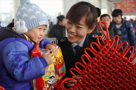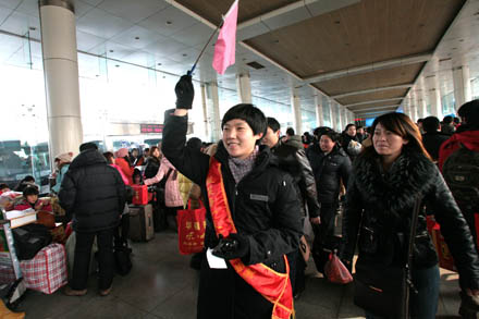 春運期間,盡管客流量較大,但集團公司各項創先爭優活動和惠民服務措施始終有效開展。圖為集團公司總部黨員、團員組成小紅帽送溫暖義務服務隊、愛心志愿車隊,為旅客積極服務,受到廣大旅客歡迎。