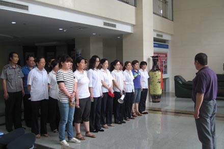 演練中,值班保衛(wèi)人員發(fā)現(xiàn)火情,立即向當值領(lǐng)導匯報,并用樓道滅火器進行初期滅火,控制火勢蔓延,與此同時另一保衛(wèi)人員迅速撥打119報警,準確描述起火地址、單位、火勢等信息。當值領(lǐng)導接到報警后,立即啟動火災疏散應(yīng)急預案,救援小組迅速斷開大樓電源開關(guān),并關(guān)閉電梯;滅火小組人員火速趕赴現(xiàn)場進行滅火;警戒組在火災現(xiàn)場拉起警戒線,維護現(xiàn)場秩序,并安排專人在一樓疏導車輛,保證消防通道暢通;疏散小組組織總部員工用濕毛巾捂住口鼻,低頭彎腰從兩側(cè)消防通道迅速有序撤離;救援小組隨即對各樓層進行緊急搜救。5分鐘后,全體人員撤離到樓下安全地帶。經(jīng)清點人數(shù),所有員工全部安全疏散。