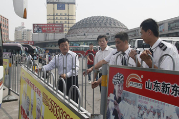 節(jié)日期間,濟(jì)南市交通局將臨時(shí)加班車手續(xù)審核點(diǎn)設(shè)立在發(fā)車一線,在確保加班車審驗(yàn)資質(zhì)合格的情況下,簡化手續(xù),加快流程;交警部門則采取了“東西方向大型客車借道BRT通行;車站西邊工商河?xùn)|側(cè)馬路實(shí)施交通管制”等5大舉措,對總站周邊車流進(jìn)行交通管制,使站內(nèi)車輛及時(shí)分流,確保了站內(nèi)、站外交通循環(huán)通暢,為今年十一黃金周旅客安全順暢出行提供了有力保障。濟(jì)南長途汽車總站微信平臺也發(fā)揮了積極的疏導(dǎo)作用,市民按照隨時(shí)掌握的車次信息及票務(wù)情況,合理安排行程,有效避免了部分線路客流過于集中,使各線路運(yùn)行更加快捷通暢。
