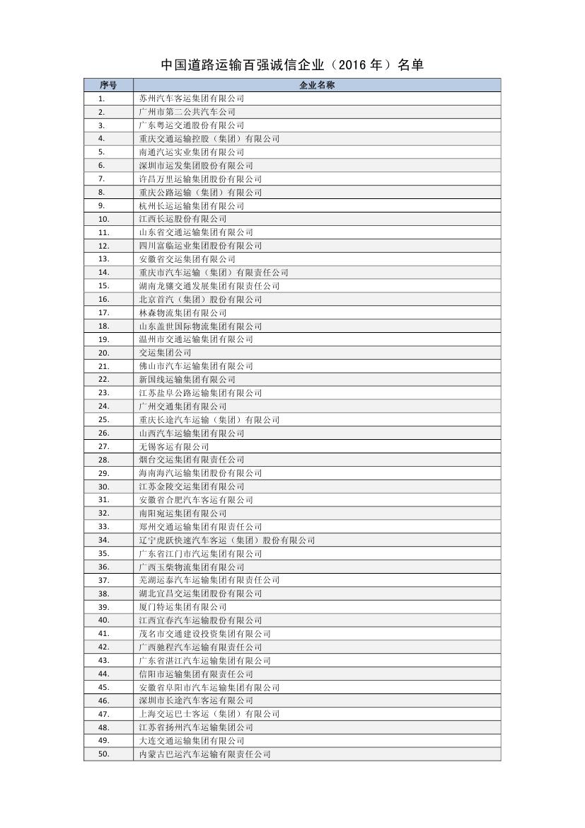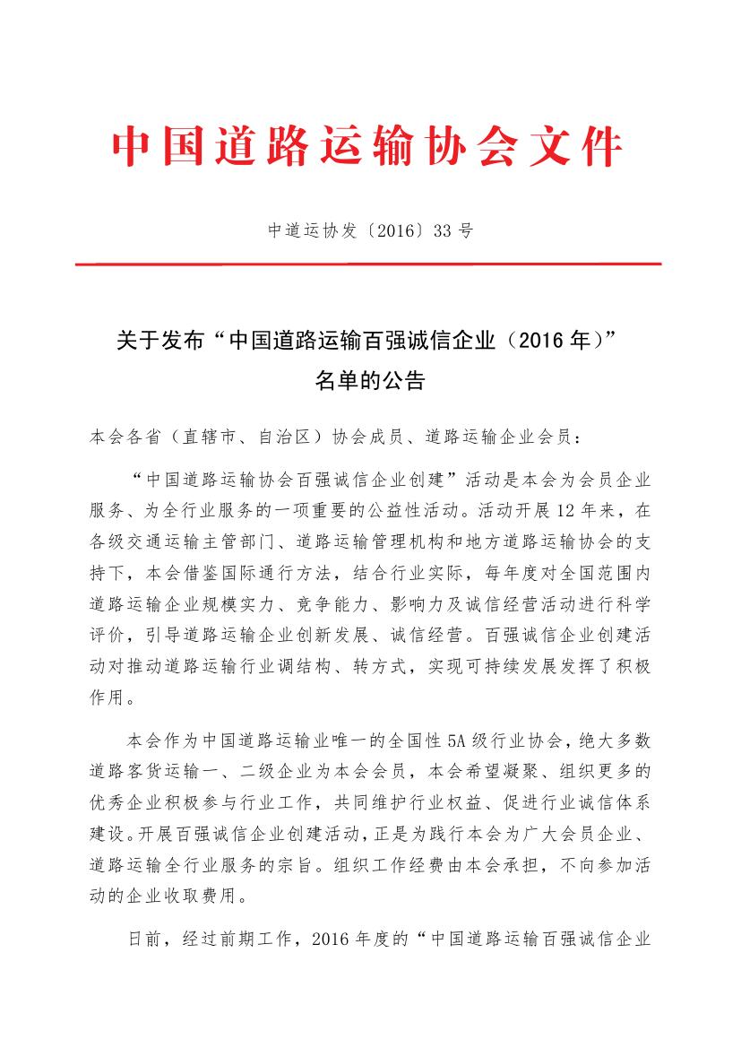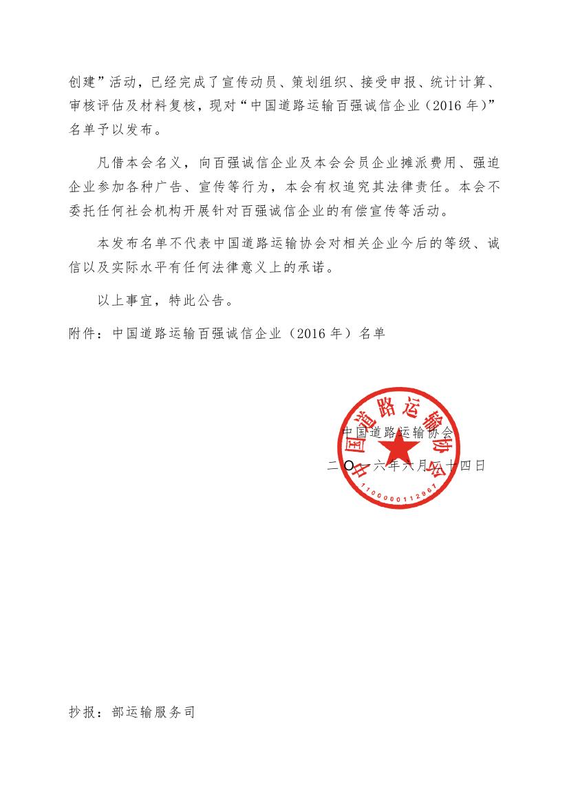 6月24日,中國道路運輸協(xié)會發(fā)布了2016年度道路運輸百強誠信企業(yè)名單,集團再度榮獲“全國道路運輸百強誠信企業(yè)”稱號,排名第十一位,比去年前進一個名次。