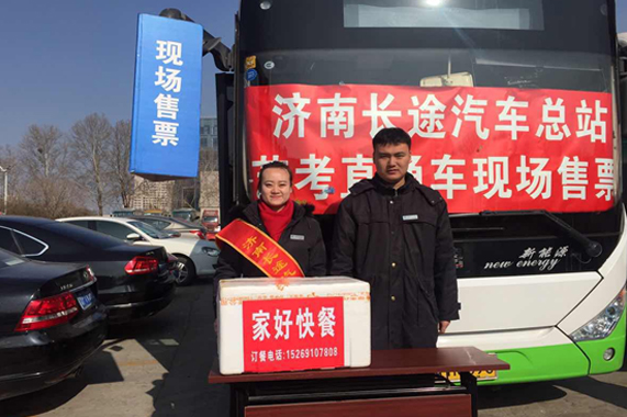 現(xiàn)場售票便利藝考 總站南北兩區(qū)均在考生集中的舜耕國際會展中心、濟南二中考點設(shè)立售票點,為廣大學(xué)子提供現(xiàn)場售票、免費接站、現(xiàn)場發(fā)車的便捷服務(wù),節(jié)省了廣大學(xué)子在路途上的時間。同時提供 “藝考溫馨小貼士”,把各個考點的詳細信息、乘車班次、發(fā)車時間等信息發(fā)放給考生,方便出行。