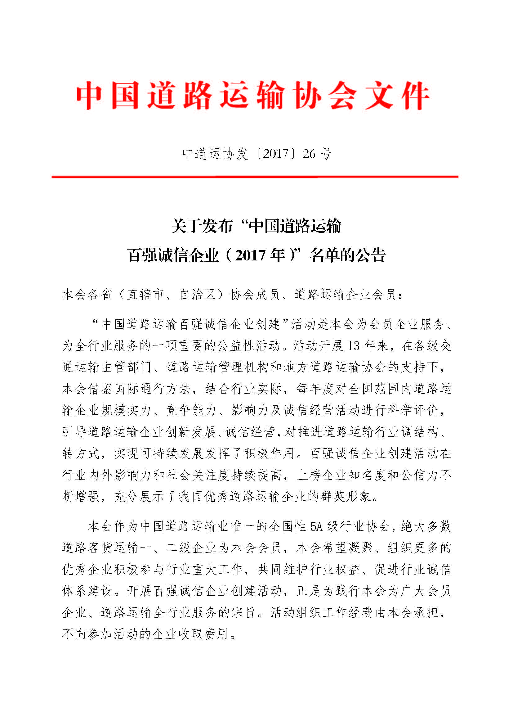 集團公司榮獲“中國道路運輸百強誠信企業(2017年)”第九位
