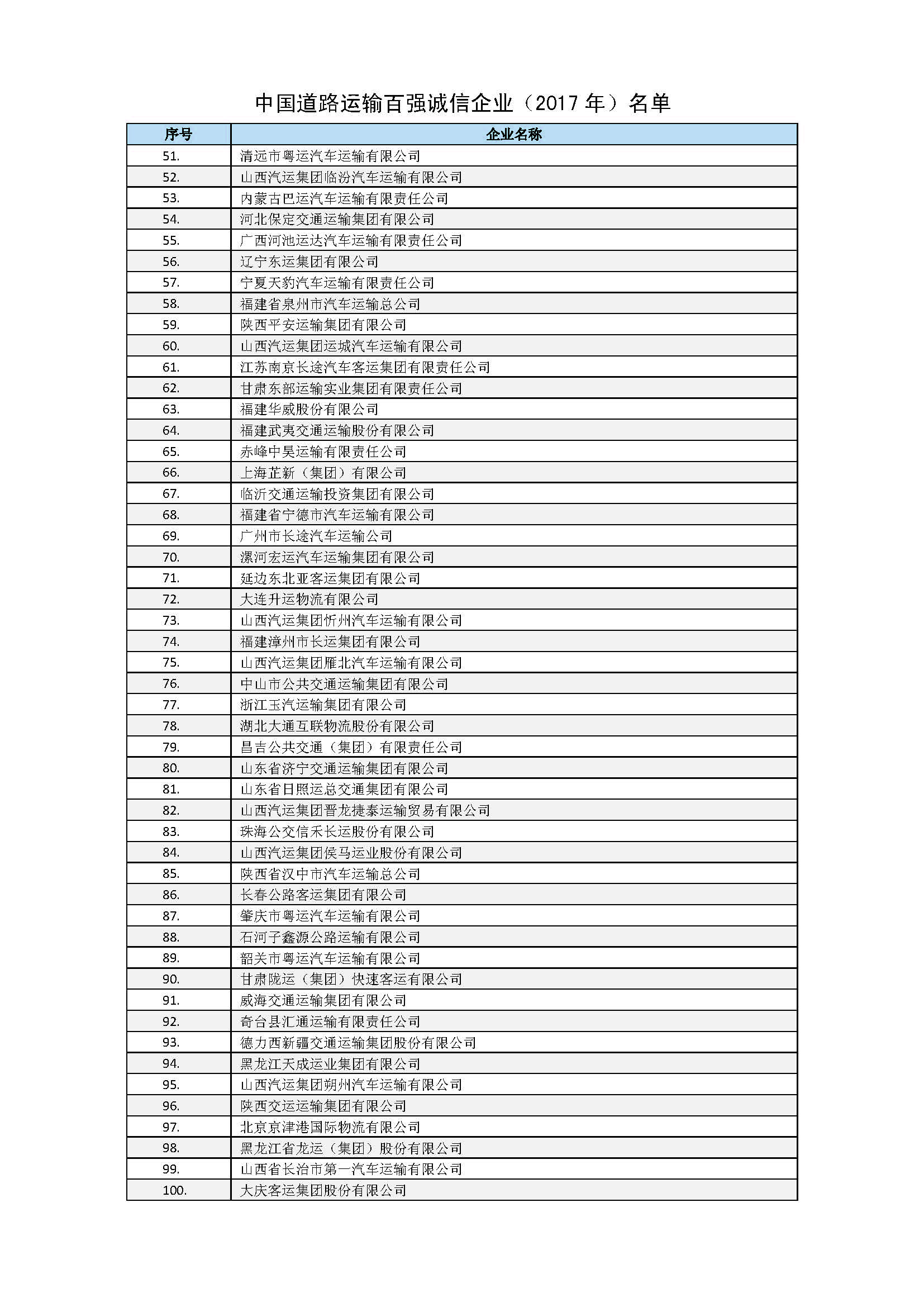 “中國道路運輸百強誠信企業(2017年)”第九位
