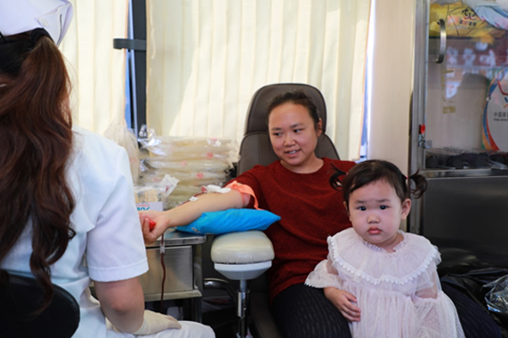在獻血現場,有一個兩歲的小姑娘引起了我們的注意,有點害羞的她躲在一位老人身后。本以為是過往的旅客,可是后來得知她是交運石化公司員工趙欣的女兒,知道媽媽要獻血,懵懵懂懂的她也來到現場,感受媽媽是如何盡己之力幫助別人的!