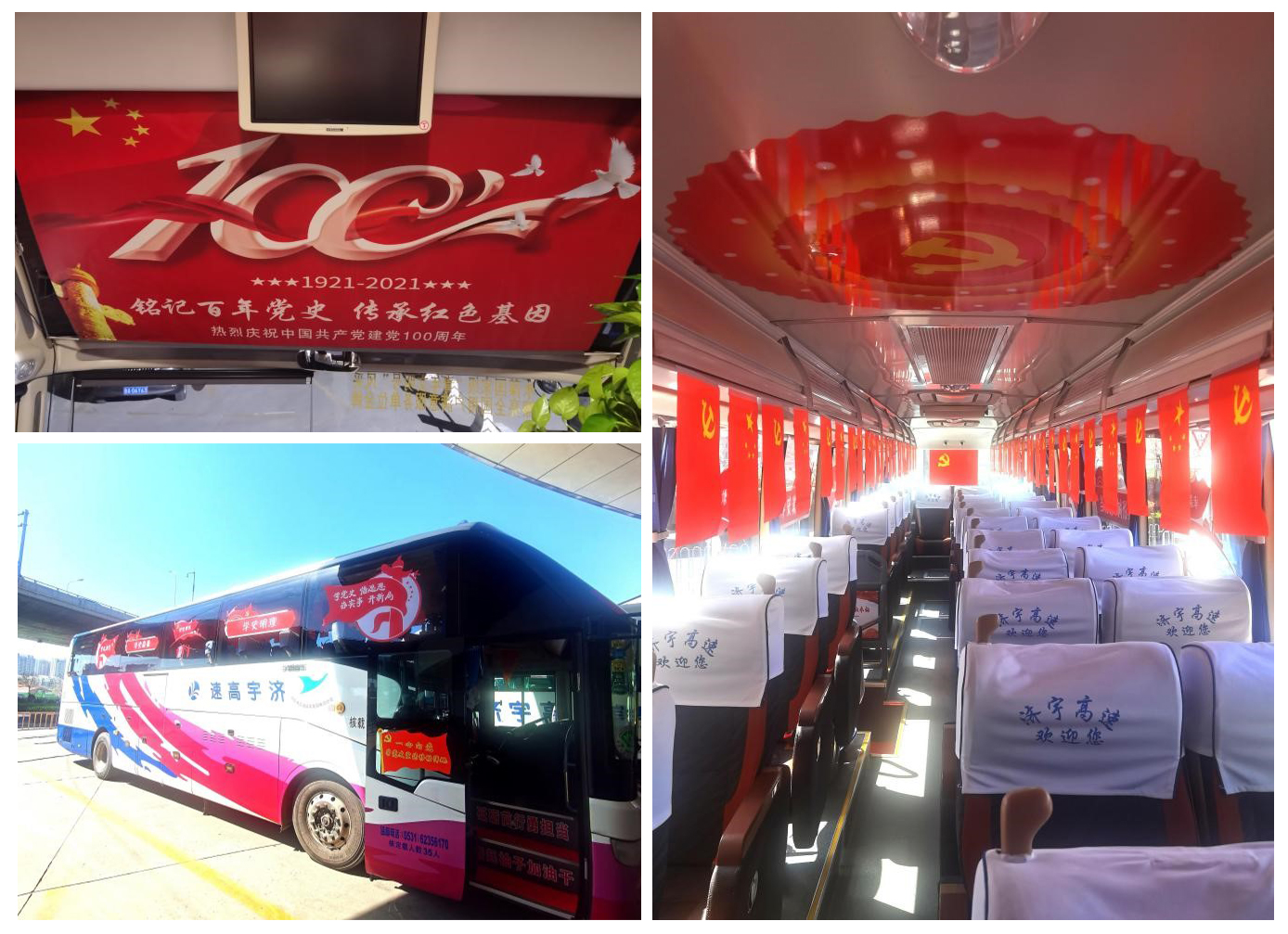 同時,濟宇高速還將車輛進行升級改造,推出“學黨史宣傳陣地”專用車輛,在十米車廂內營造出“銘記百年黨史,傳承紅色基因”的濃厚氛圍,講述了我黨從無到有,由微及著的艱辛歷程,依托客運班車靈活、便捷的優勢進行多形式、多角度、全方位宣傳,使“學黨史”更加接地氣、聚人氣、見效果,將“學黨史”宣傳到更多的百姓心中,引導大家準確把握開展黨史學習教育“學史明理、學史增信,學史崇德,學史力行”的目標要求,做到學黨史、悟思想、辦實事、開新局。