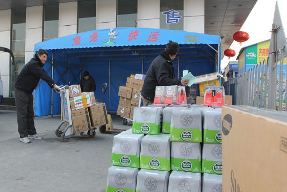 2月2日是小年后的第二天,從總站南區發往省內各地的貨物開始激增,主要以各類食品為主。兔兔快運迅速設立專門區域存放、值守,特別是對啤酒一類玻璃容器貨物,更是嚴格按照碼放標準存放,避免因碰撞、墜落等原因而損壞,并確保在運輸途中得到全程監管。針對蔬菜、海鮮等時令生鮮類貨物,開辟了“快速”通道,優先收取和送達。
